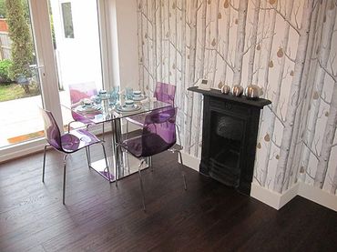We started with completely re-wiring the house and installing a complete central heating system. The existing galley kitchen was so tiny we knocked through to the dining room to create a lovely open plan family space. We also installed large French doors to the garden and using a Cole & Son feature wallpaper we aimed to bring the outside space together with the inside space to create a fluid and harmonious living area.