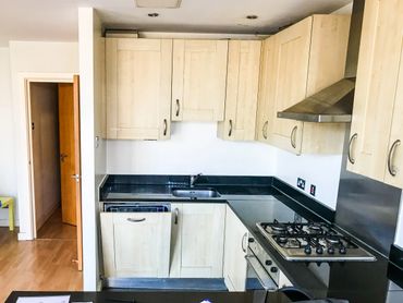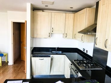 The kitchen is complete, and we’ve used our favourite green glossy tiles for the splashback again, well after all why spoilt a good thing! The leak has been sorted, fortunately and the damage made good again. The internal doors are on too, I’m using the shaer effect doors and for the hall door with glass panels so get some light into the centre of the flat.